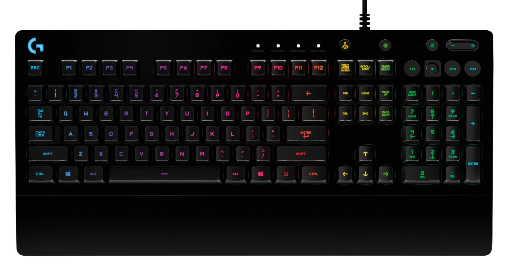 Teclados y ratónesTeclado RGB Gaming. Durabilidad apta para los requisitos del gaming. Los interruptores de tecla Mech-Dome táctiles son resistentes a salpicaduras. Iluminación RGB LIGHTSYNC personalizable. Reposamanos integrado y patas ajustables. Controles multimedia específicos.